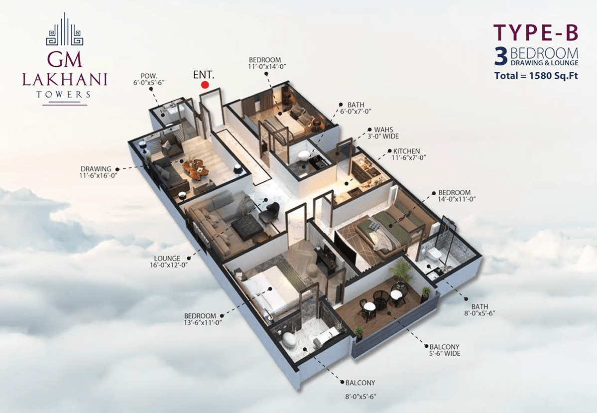 Spacious living areas: The apartment units in GM Lakhani Towers offer spacious living areas, allowing comfortable living for your families and guests. All the apartments feature multiple bedrooms, a living room, dining area, and balcony.